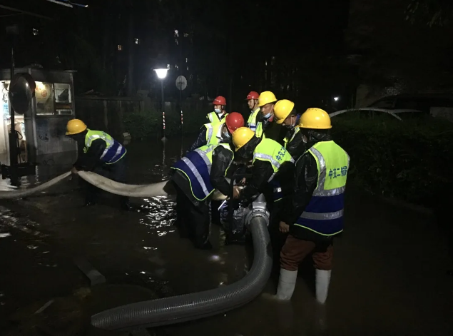 “金银湖街道汀香北路附近出现严重积水,车辆阻塞,情况危急!”7月7日17点10分,中交二航局长江国际公司主动请“战”,成立防汛抢险工作小组和中交二航局长江国际公司“防汛抢险”青年突击队,投入抗涝防汛抢险之中。当晚20点17分,突击队携带6台移动式应急排水泵和抢险器材抵达现场,顶着暴雨开始工作。突击队30多人,分别在3个积水点紧张地连续抢险作业后,道路积水明显好转。截至7月8日凌晨5点,该处险情基本控制,地面无积水,下水道水位降到最低点。