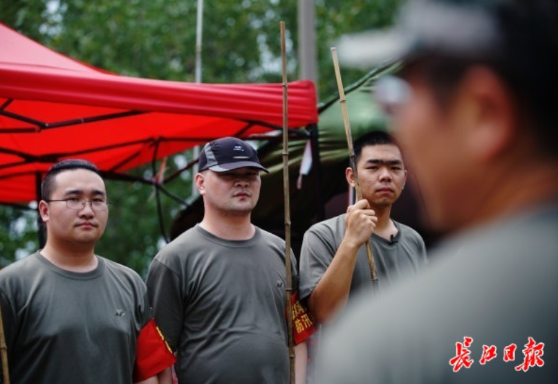 7月11日下午,武汉武金堤张家湾街驻守堤段,8名青年突击队队员手拿长竿站成一排,正准备出发巡堤。队伍排头是一位身材瘦高、留着寸头的年轻小伙,叫周亮宇,是一名刚参加完高考的学生。