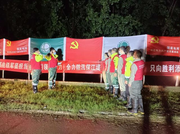 7月7号晚,国网湖北电力防汛护堤临时党总支书记薛昌波带领当日值守的防汛突击队员,重温入党誓词。 图片来源:湖北之声FM1046