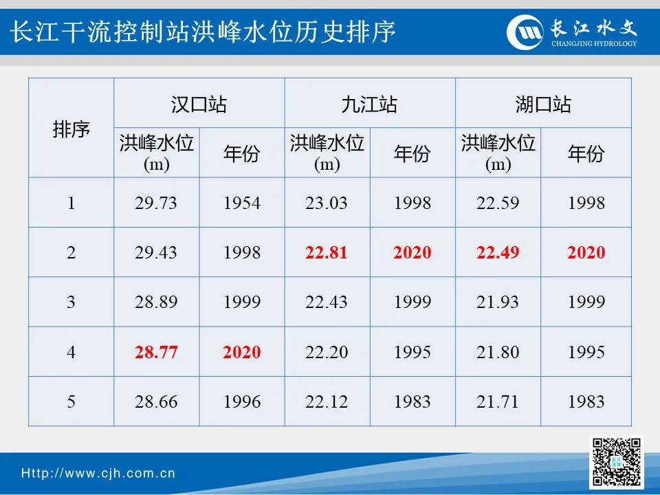 长江干流九江站,洪峰水位22.81米,峰现时间2020年7月12日18时;