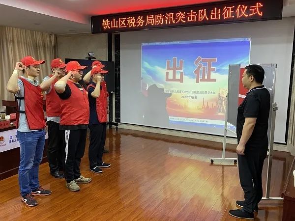“我是党员,只要有需要,这次突击队一定要算上我,我来带队。”在出征仪式上,黄石市铁山区税务局党委委员、副局长柯尊斌认真说到,与其余4名党员进行简单宣誓仪式后,立刻奔赴汛情一线。