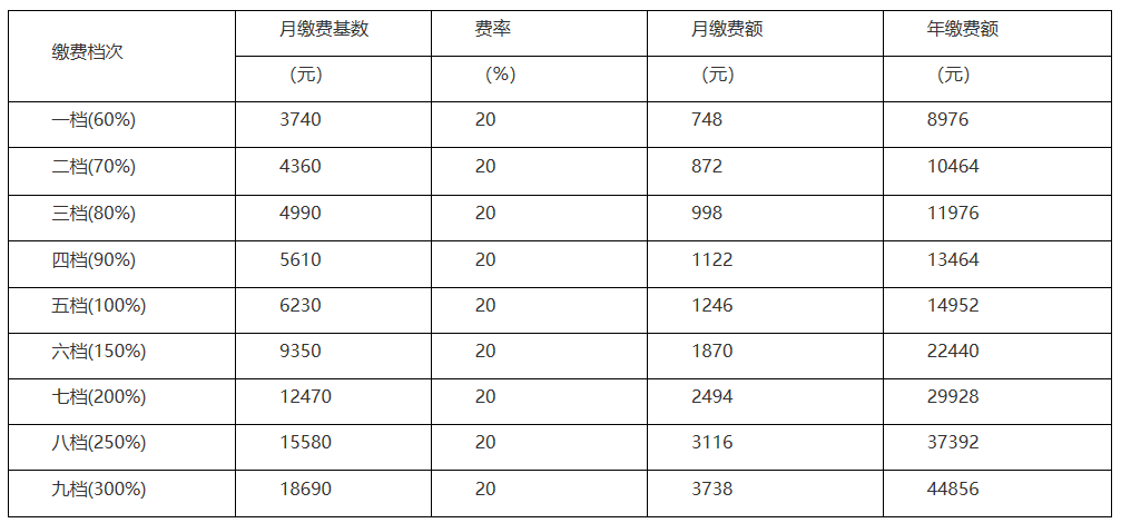 省直2020缴费年度灵活就业人员基本养老保险缴费基数、缴费标准仍按2019缴费年度标准执行。2020年7月至2021年6月,省直灵活就业人员基本养老保险费的缴费基数,按省直养老保险缴费基数标准的60%、70%、80%、90%、100%、150%、200%、250%、300%设定为9个档次,分别为: