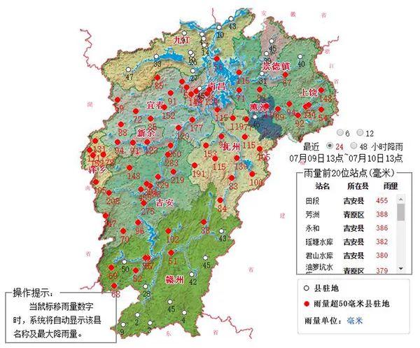 7月10日,江西省水利厅网站“实时降雨”图上,大片红点正在闪烁。