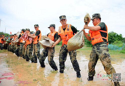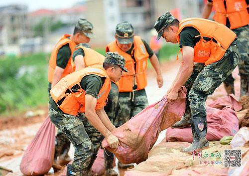江南都市报讯 曹先训、全媒体记者许南平摄影报道:7月12日0时,鄱阳县鄱阳镇朱家桥村至江家岭村昌江圩水位已高出路面1米多。因长期受高水位浸泡,堤坝严重渗水,随时有溃堤危险。武警江西总队500余名官兵坚守堤坝一线。12日7时,昌江圩江家岭村堤坝出现渗水群,300多名官兵轮流出击,有效控制了险情。