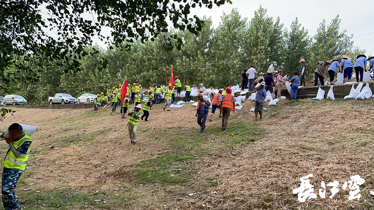 小池镇长江干堤防汛抗旱指挥部迅速调遣200余人紧急抢险。现在渗水带上铺40公分的黄沙,然后在黄沙上搭建50公分的黄土沙包。通过这种方式将渗水带死死压实,控制堤坝内的土壤被带出,保障大坝安全。