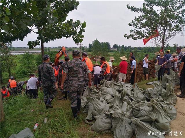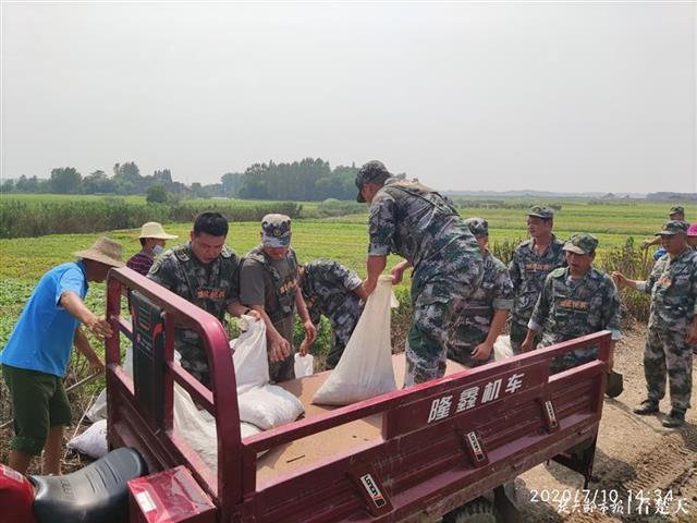 7月10日下午,武穴市万丈湖办事处万丈港龙莲路段出现满堤,万丈湖办事处武装部部长张演超组织60名民兵队员将150米堤坝筑高1.2米。武穴市花桥镇荆竹河郑公塔段出现溃口,武穴市人武部迅速出动民兵在花桥镇荆竹河、万丈湖办事处农场港执行巡堤查险任务。