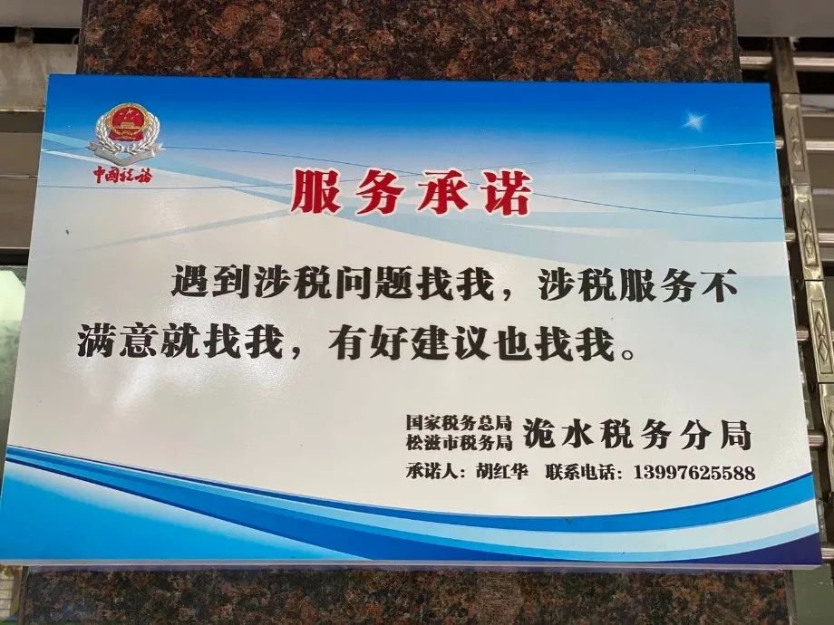 “我们郑重承诺:遇到涉税问题就找我、涉税服务不满意就找我、有好建议也找我!”7月1日,松滋市税务局洈水税务分局的服务承诺公示牌吸引了众多前来办税的纳税人的注意,洈水税务分局局长胡红华的联系方式也出现在了公示牌上。