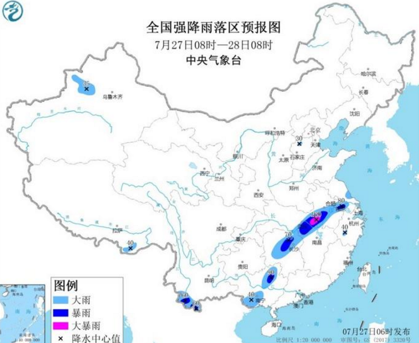 据中央气象台网站消息,中央气象台7月27日6时继续发布暴雨蓝色预警。预计,7月27日8时至28日8时,新疆伊犁河谷、云南西南部、广西北部和南部、湖南中北部、湖北东部、安徽中南部、江苏中南部以及河北中部等地的部分地区有大到暴雨,其中,湖北东部、安徽西南部等地局部地区有大暴雨(100~160毫米)。