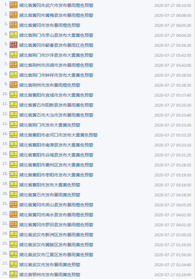 武汉市气象台2020年07月27日01时53分发布暴雨黄色预警信号:预计未来6小时,江夏南部、黄陂南部、新洲、东西湖东部将有50毫米以上降水,伴有雷电,阵风5-7级,城乡渍涝、山区山洪、地质灾害、中小河流洪水风险较高,请注意防范。