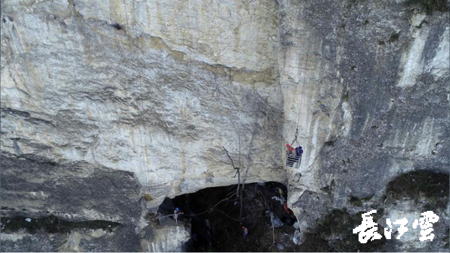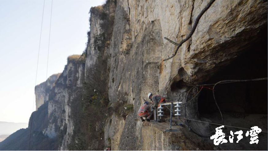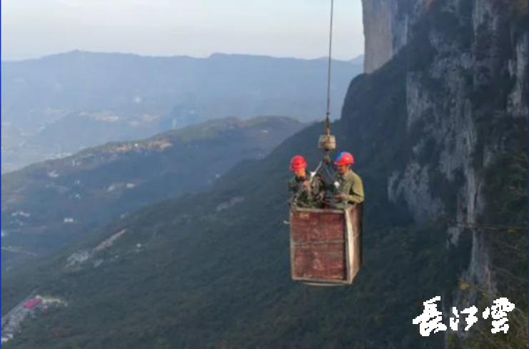 这块绝壁,叫朝东岩,南北长一万米、最高四百米。悬崖上,一根缆绳一头连着崖顶的吊车,一头连着简易吊篮,吊篮凌空下降逾百米,晃晃悠悠地靠近峭壁间的一个岩洞……他们,在给绝壁下的田凤坪村引水。