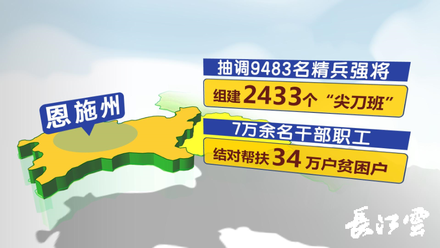自硬仗打响开始,武陵山腹地的恩施州抽调9483名精兵强将,组建2433个“尖刀班”开展脱产驻村扶贫。7万余名干部职工结对帮扶34万户贫困户,实现结对帮扶全覆盖。解决147.4万人饮水安全问题,新建农村公路2.07万公里。