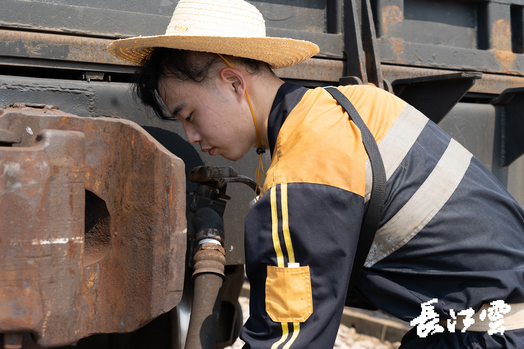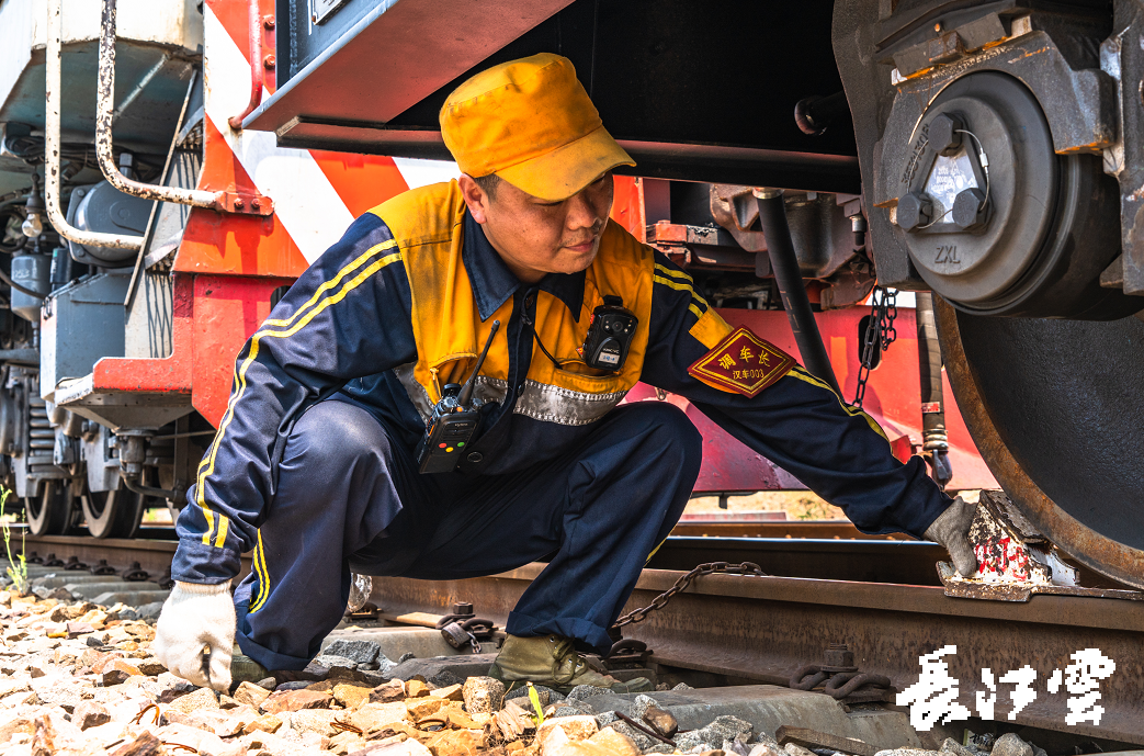 “不管温度再高,检查车辆都不能马虎,走行部位、连结处、装载情况都要一个个确认。”连结员刘柏文边说边抬头看了下刺眼的太阳,压了压帽子,又将手伸向了两车中间的风管处认真检查着链接状态......