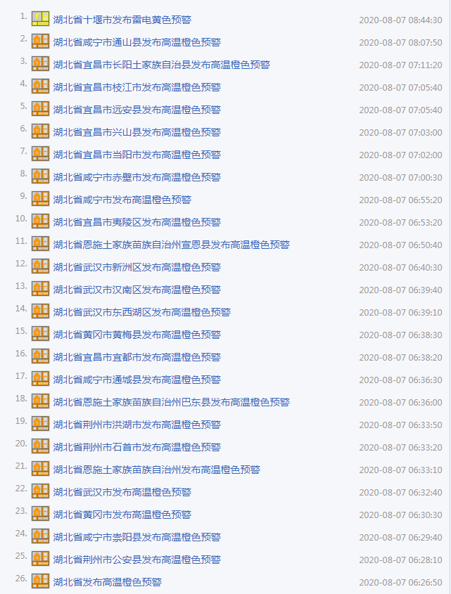 武汉中心气象台2020年08月07日06时25分发布高温橙色预警信号:预计今天白天,恩施东部、宜昌、荆州、武汉、咸宁、鄂州、黄石、黄冈南部最高气温将升至37℃以上,局部达39℃,请注意防范。