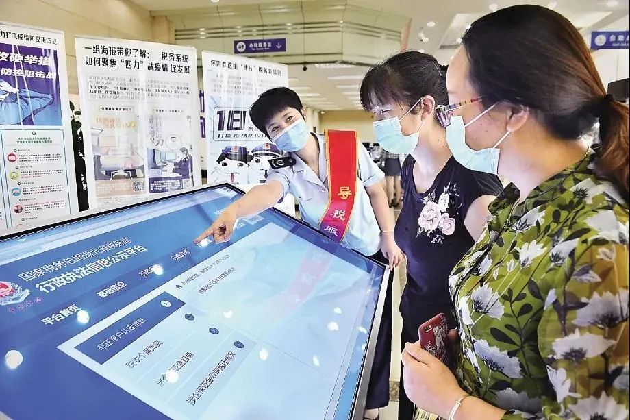 图为税务干部向纳税人介绍如何使用办税服务厅电子屏查看行政执法公示信息。(童长宇/摄)