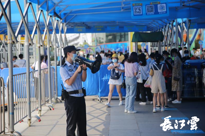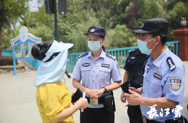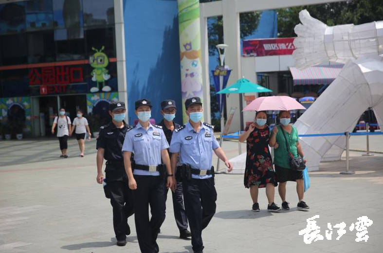 8月13日上午9点,湖光派出所民警俞茂勇、李莉便来到欢乐谷警务室,开始着手早上的游客入园工作。两人熟练的分工,李莉拿起扩音器在扫码处,一遍又一遍的提醒游客保持安全距离,提前调出手机的入场码。而俞茂勇则走进排队的长龙中,与欢乐谷工作人员一同,维持着排队秩序。在确保了入场秩序的井然有序后,俞茂勇和李莉带上两名安保队员进入到欢乐谷园区内进行巡逻。全园现开放43台套游乐设备一一走到,耐心的叮嘱游客注意排队时保持好安全间距,游玩时照看好小孩和随身携带的物品,帮助游客解决游玩时所遇到的问题。一趟巡逻下来,往往都得一个多小时。武汉这样的高温,一趟巡逻下来,衣服都是早已湿透。俞茂勇说:“这样的巡逻工作每天至少得两次,分别是上午和晚上的入园高峰期。我们警察多走动多流汗,碰到游客遇到问题及时处理,游客才能玩的更舒心。”