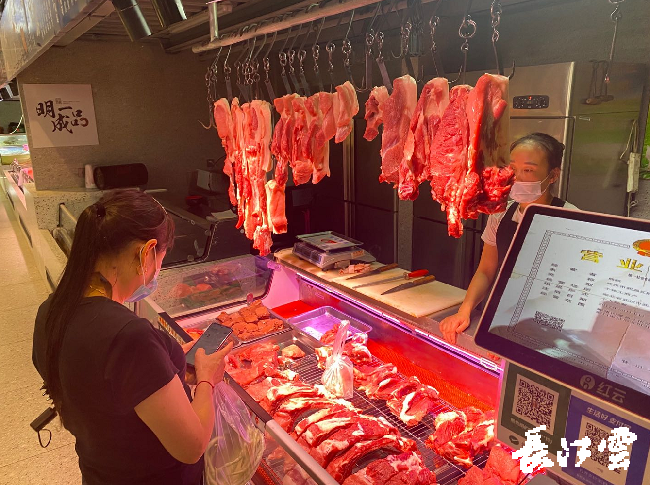 今天(15日)上午,记者来到网红菜市场,明成一品沙湖边市集。肉摊主左寿斌正在帮顾客挑选排骨。