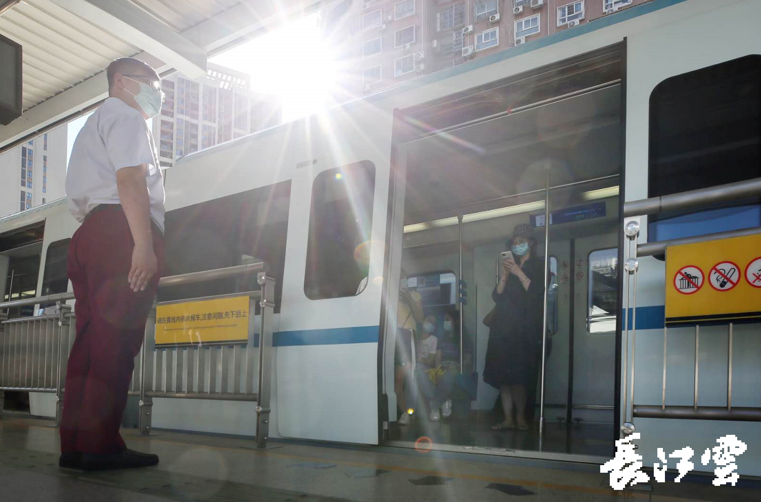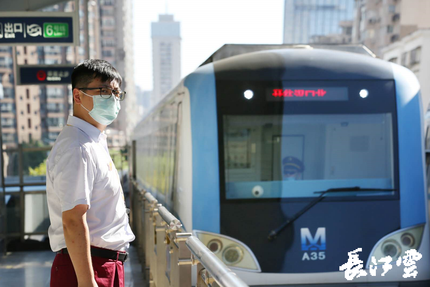 8月15日下午3时许,记者在轨道交通1号线大智路站开往汉口北方向站台体验,阳光直射地面有些晃眼,地面温度超过40度。值班站长陈家鑫接送过往列车,迎送乘客上下车。记者在现场看到,陈家鑫浅蓝色的短袖衬衣背是湿了干,干了又湿。顾不了炎热,陈家鑫认真巡视站台每一个角落,发现可疑情况及时上前查看,看到提重物的老人主动上前进行帮扶。用他话说,越是恶劣天气越要认真,只有做到工作标准不降,服务热情不减,才能最大程度保障运营安全。