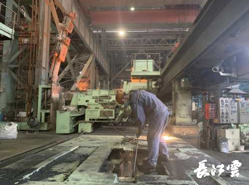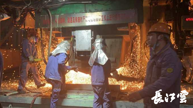 在连铸平台上,两拨工人正在作业。连铸乙班作业区作业长张玉成介绍,今天生产的是集装箱钢,在强度与轻量化方面都进行了升级改造,由于是特殊钢种,需要人工操作。张玉成说,“这个环节的工艺特点,就是要把液态的钢水凝固成需要的固态的板坯,下送到后面环节做成其他产品。”由于与液态钢水较近,这一位置的体感温度达五、六十度。