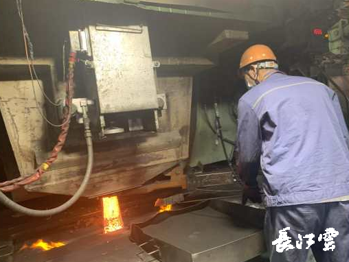 连铸机旁,每隔一两分钟,工人彭章雪就得往钢水里添加连铸生产中的重要辅材保护渣,离得最近时,距离火红的钢水不过一米。记者看到,彭章雪额头上的汗珠顺着安全帽流下,浸湿了口罩;身上里外两层的衣服也早已汗湿一大片。