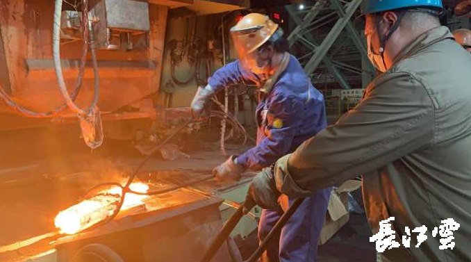 残渣调运、设备清洁、安装调试,作为作业长,张玉成必须来回穿梭,把控全局。在紧张准备工作之后,新的钢水重新灌入连铸机结晶器之中,一时间,钢花四溅。
