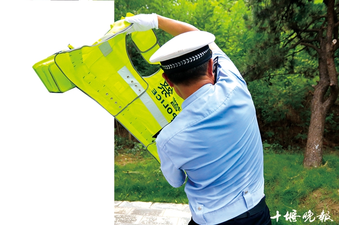 烈日下,交警李斌的衣服被汗水浸湿透了,贴在后背上。