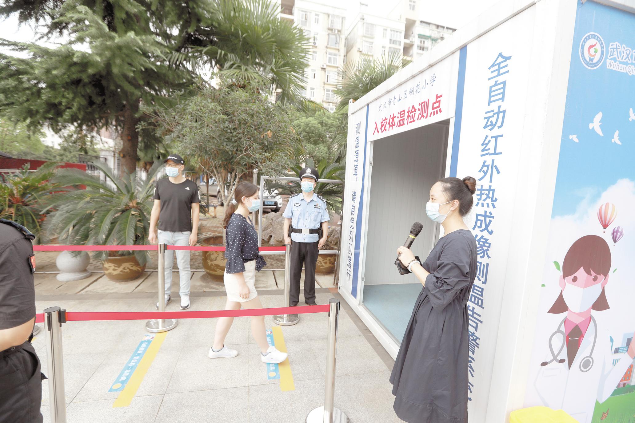 8月25日,武汉市青山区钢花小学教职员工在校门口进行体温模拟检测。