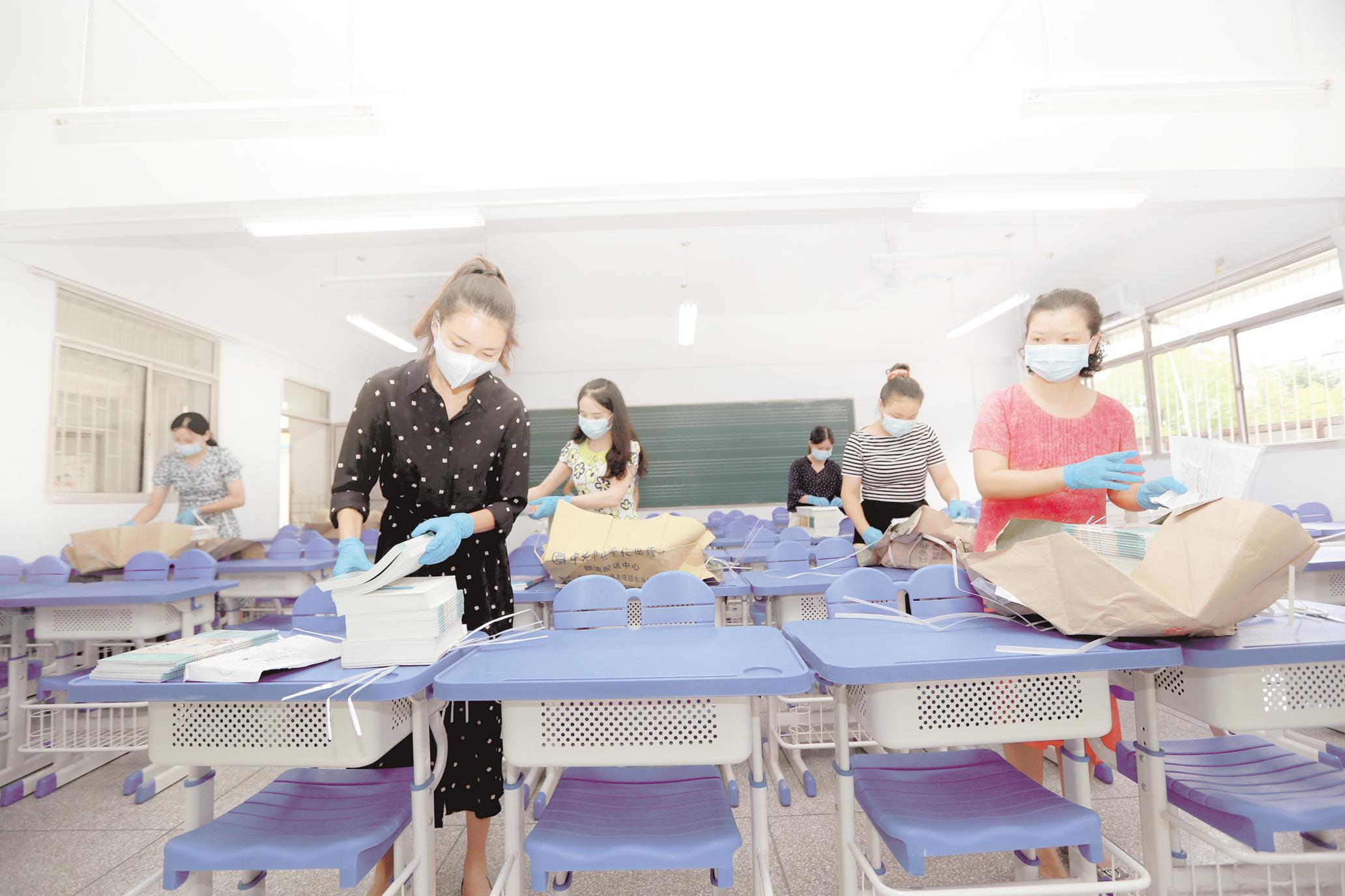 8月25日,武汉市青山区钢花小学老师、武汉抗疫志愿者华雨辰(前左)和李霞(前右)正在为一年级新生准备教材。该校教职工和青山公安分局干警提前进入“备战”状态,确保秋季学期开学安全有序。