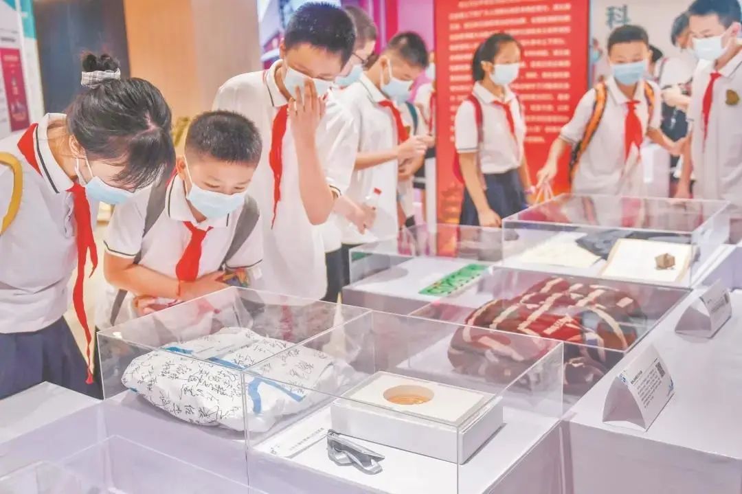 图为:小学生参观抗疫纪念品(楚天都市报 黄士峰 摄)