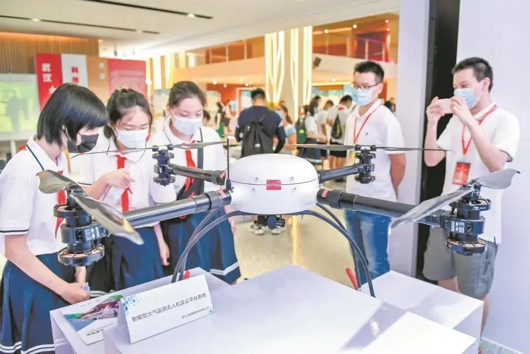 图为:在武汉规划展示馆科普展区,参观者观看智能型大气监测无人机。 (楚天都市报 黄士峰摄)