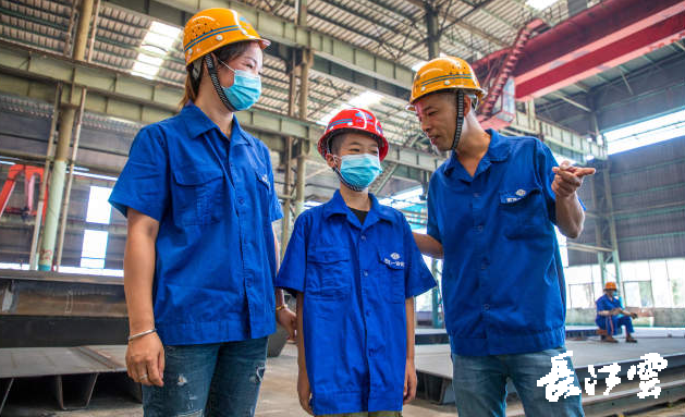 在阳逻生产基地车间,今年11岁的余宏富在父亲余楚国、母亲杨小娟的陪伴下,兴致盎然地参观了车间制作区。在参观过程中,小小少年余宏富对钢结构的生产工艺、制作流程产生了浓厚的兴趣,感受到了中国一冶细致入微的企业文化,尤其是标准化车间、花园式工厂的建设给他留下了深刻印象。“想着我的爸爸妈妈每天都能在这样的环境下工作,我为他们感到骄傲,更为自己是“一冶人”的下一代感到自豪。我一定好好学习,不负一冶公司的期望,做一个对社会有用的人。”