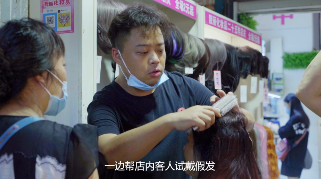 晚上8点,热闹的武汉保成路夜市中,肖昊忙得不亦乐乎,他一边向过路的行人吆喝着,一边帮店内客人试戴假发,没多久便卖出去不少商品。