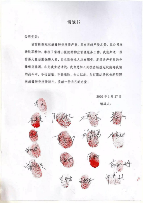 “我自愿加入到抗击新型冠状病毒疫情的战斗中,不怕困难、不畏艰险、全力以赴,为打赢这场疫情战斗……”在请战书上按下手印的东方物业公司副总经理陈飚,放弃照顾身体不适的女儿,第一时间赶赴医院现场摸底。他带领团队充分掌握现场状况,针对传染病医院的物业管理,明确项目需求、制定管理方案,细化工作流程。