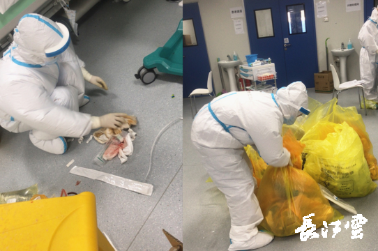 雷神山医院共设置3间ICU病房。杨玲独自负责1间ICU病房和护士站共近400平方米区域内的清洁卫生、日常消毒,垃圾清运工作,需细致地消杀仪器设备、患者床、门窗、地面,清理危重症患者的呕吐物、排泄物、血液、痰液等污染物,清理针头导管、透析废液、药品、废弃防护服等各类医疗废物以及处理死亡患者的床单被褥等遗物。“ICU病房垃圾产生速度太快,每个患者病床旁都有一个1.2米高的大号垃圾桶,早上去就看到每个垃圾桶装了满满一大袋,平均一天就要清运30多袋医疗垃圾。”