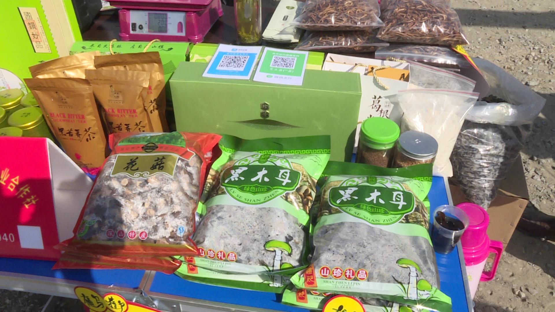 【福地马安乡村旅游开发有限公司业主:这是我们福地马安乡村旅游开发有限公司生产和统筹的产品 主要有蜂蜜 葛根粉 香椿芽 葛根片 还有山竹笋 今天上午借助石塔河丰收节这个机会 我们到这卖我们的特产 效果非常好 今天上午卖了将近2000块钱 估计今天一天能卖4000多块钱】