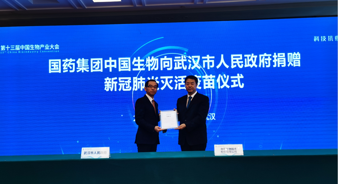 同时,国药集团中国生物技术股份公司还向武汉市人民政府捐赠10万人份(20万支)新冠肺炎灭活疫苗,用于武汉抗疫一线人员及驰援武汉的医护工作者的自身防护。国药集团中国生物董事长杨晓明代表公司向武汉市陈红辉副市长递交了捐赠书。
