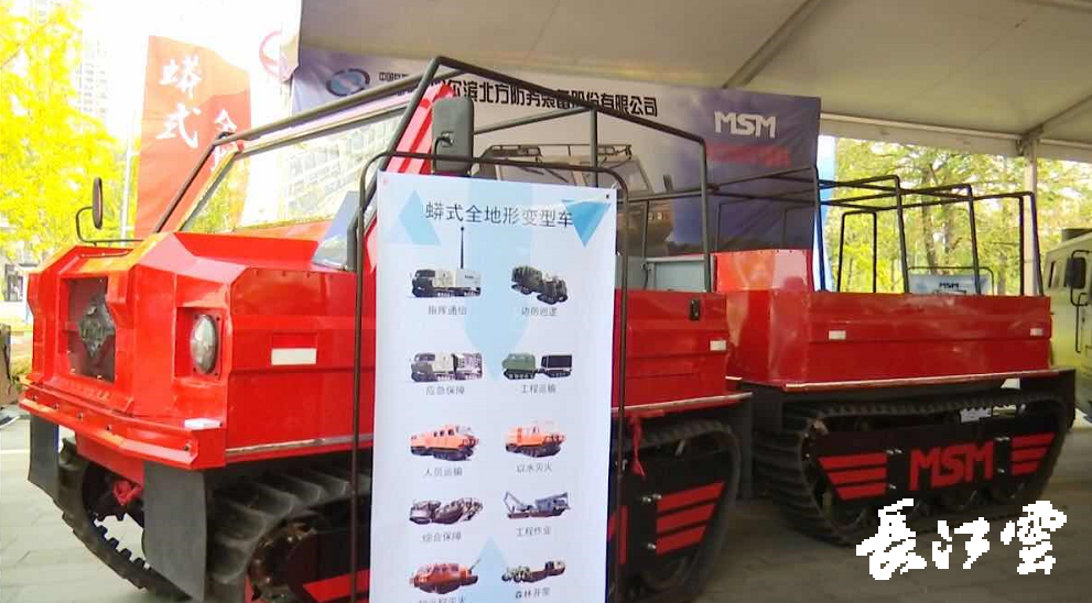 蟒式全地形双节履带车是军工企业为此次大会专门定制的。它最大的特点是能在风、沙、雨、雪等极其恶劣气候条件下,实现自由穿行,目前已经完成不少抢险、消防、医疗救护、工程作业、通讯指挥等作业。