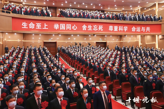 “生命至上、举国同心、舍生忘死、尊重科学、命运与共。”会场内悬挂的巨大横幅,昭示着他们共同的信念。
