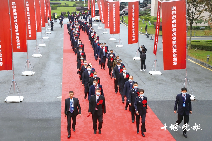 10月12日上午,十堰市抗击新冠肺炎疫情表彰大会在市行政会议中心召开。来自全市的抗疫英雄们胸前佩戴着红花,阔步入场,目光坚毅,满脸自信。
