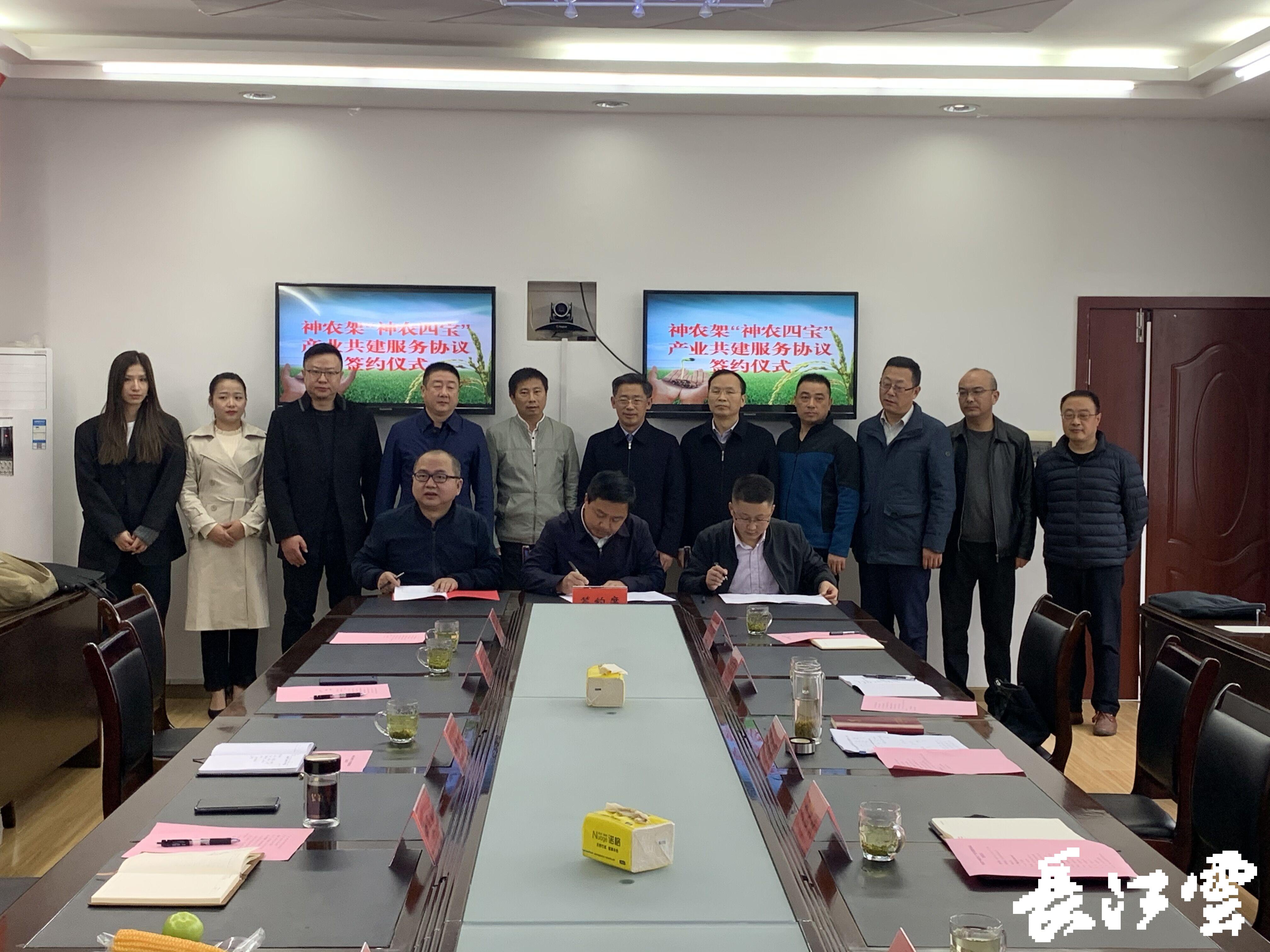 神农架林区党委副书记、政府区长刘启俊与湖北省生态农业有限公司总经理尹玉刚、神农架炎皇有机农牧有限责任公司总经理胡量共同签订了《神农架“神农四宝”产业共建服务协议》。