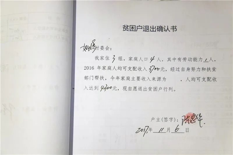 在扶贫工作队的帮助下,陈忠华一家的生活一天天好起来。2017年,陈忠华挣了近5万元。当年11月6日,他在“贫困户退出确认书”上,签下了自己的名字。