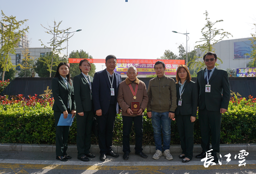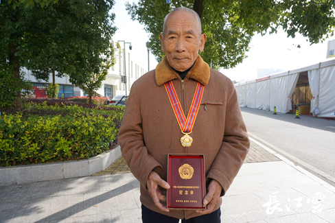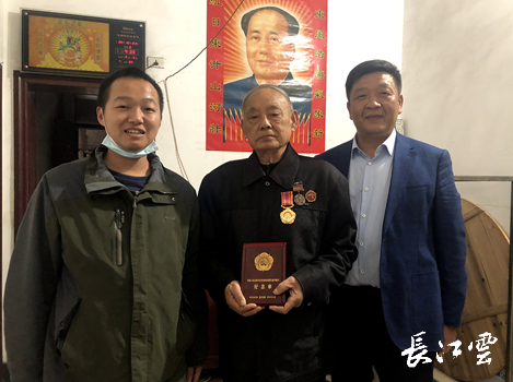 得知工作人员专程驱车100公里到孝感,黄桂斌老爹爹非常感动,不住的拉着工作人员的手表示感谢,“真是辛苦你们驱车这么远来给我送纪念章。”