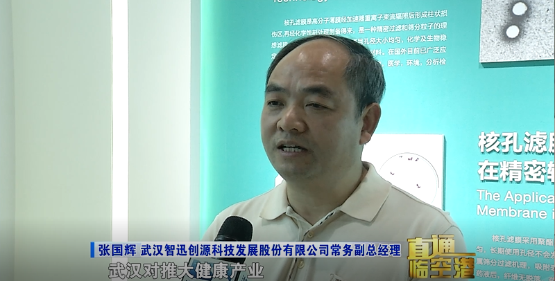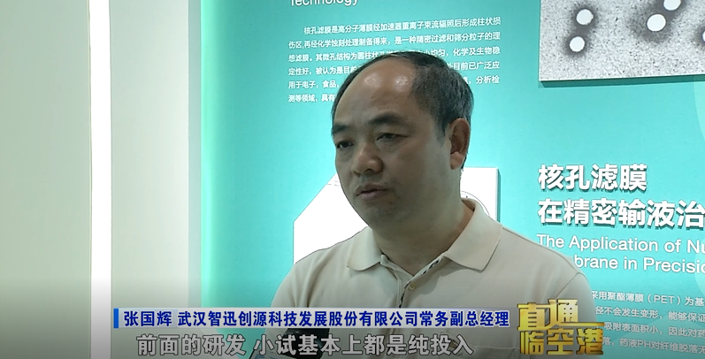 武汉智迅创源科技发展股份有限公司首席科学家罗勇:它是用一种核技术的办法,做出来的一个表面型过滤介质,所以它的通量大,一般传统的介质容易堵塞流速慢,不太适合临床应用,关于微粒污染,由于当时受技术限制国内基本上没有,而这个是从我们公司开始的,所以为什么说智迅创源开创了整个行业的这一个新领域。