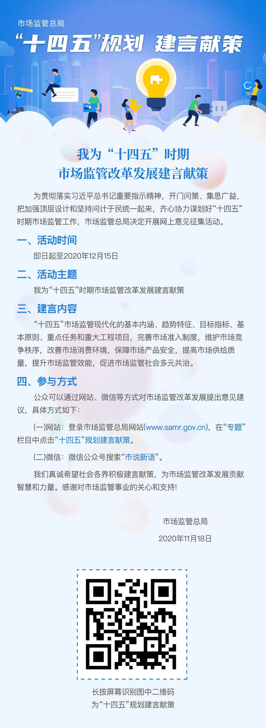 为贯彻落实习近平总书记重要指示精神开门问策、集思广益,把加强顶层设计和坚持问计于民统一起来,齐心协力谋划好“十四五”时期市场监管工作。市场监管总局决定开展网上意见征集活动。