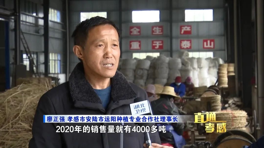 孝感市安陆市运阳种植专业合作社理事长 廖正强:我们这个产品用于园林绿化,树根、树干的绑扎,用于陶瓷厂花盆、琉璃瓦的包装,因为适销对路、供不应求,已经远销到湖南、江西、浙江多个省份,2020年的销售量就有4000多吨。