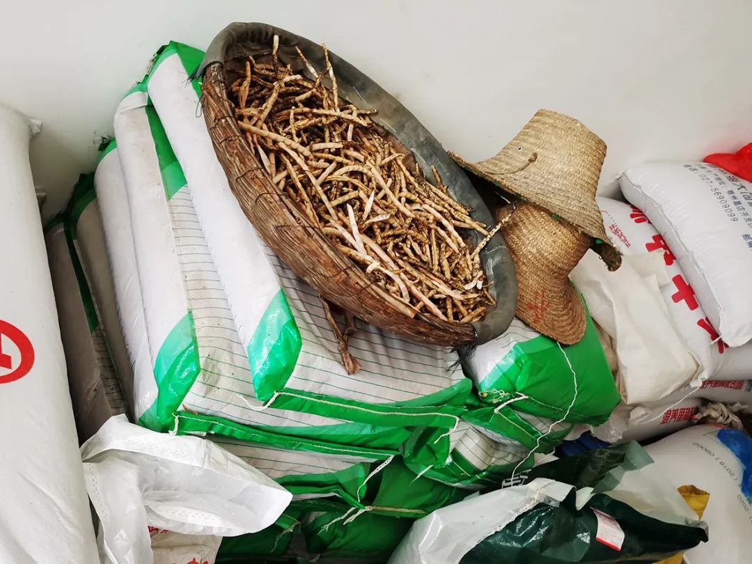 ▲墙边堆放的水稻种子、化肥和鱼虾饲料