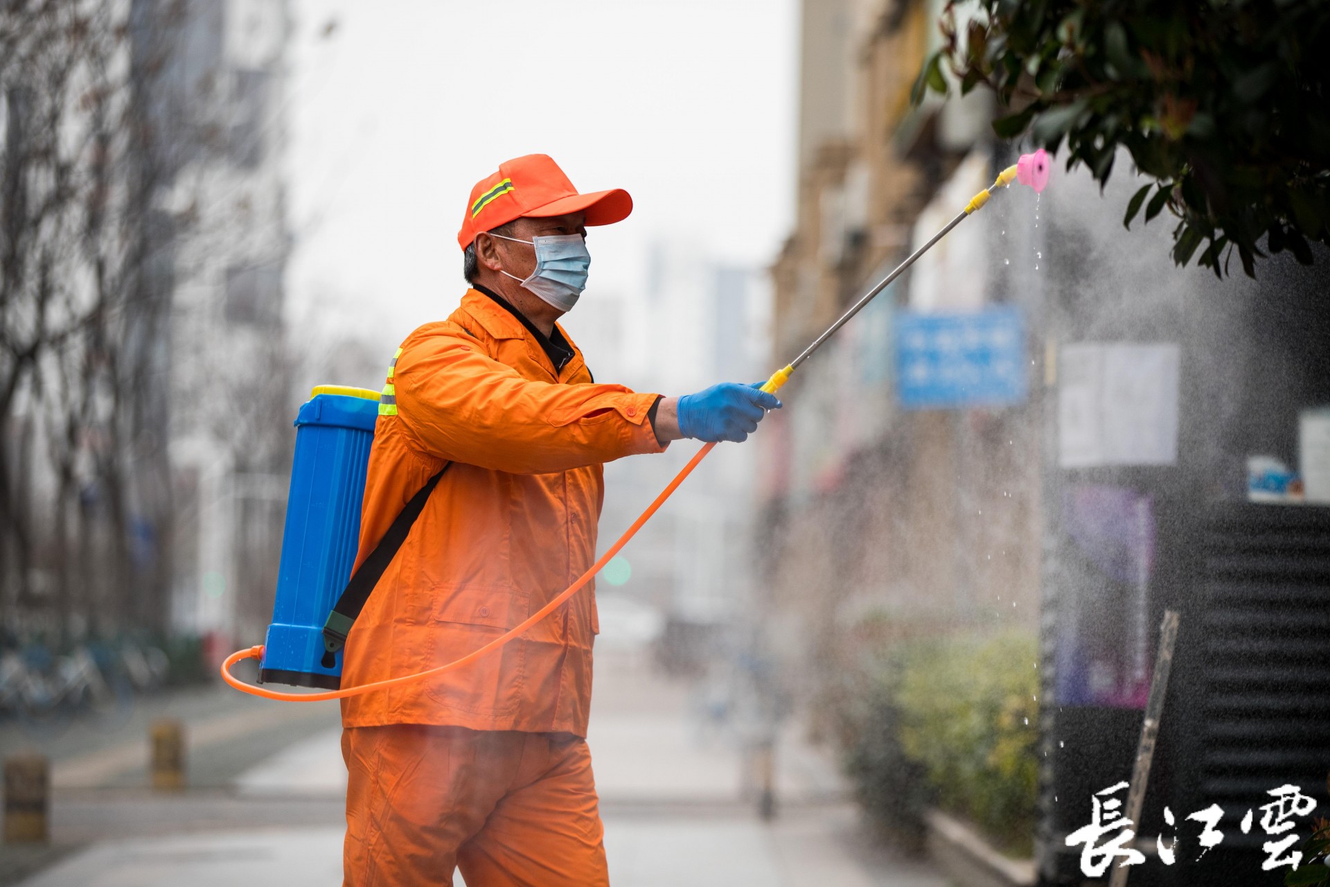 2020年2月26日,环卫工人正在空无一人的街道消毒。