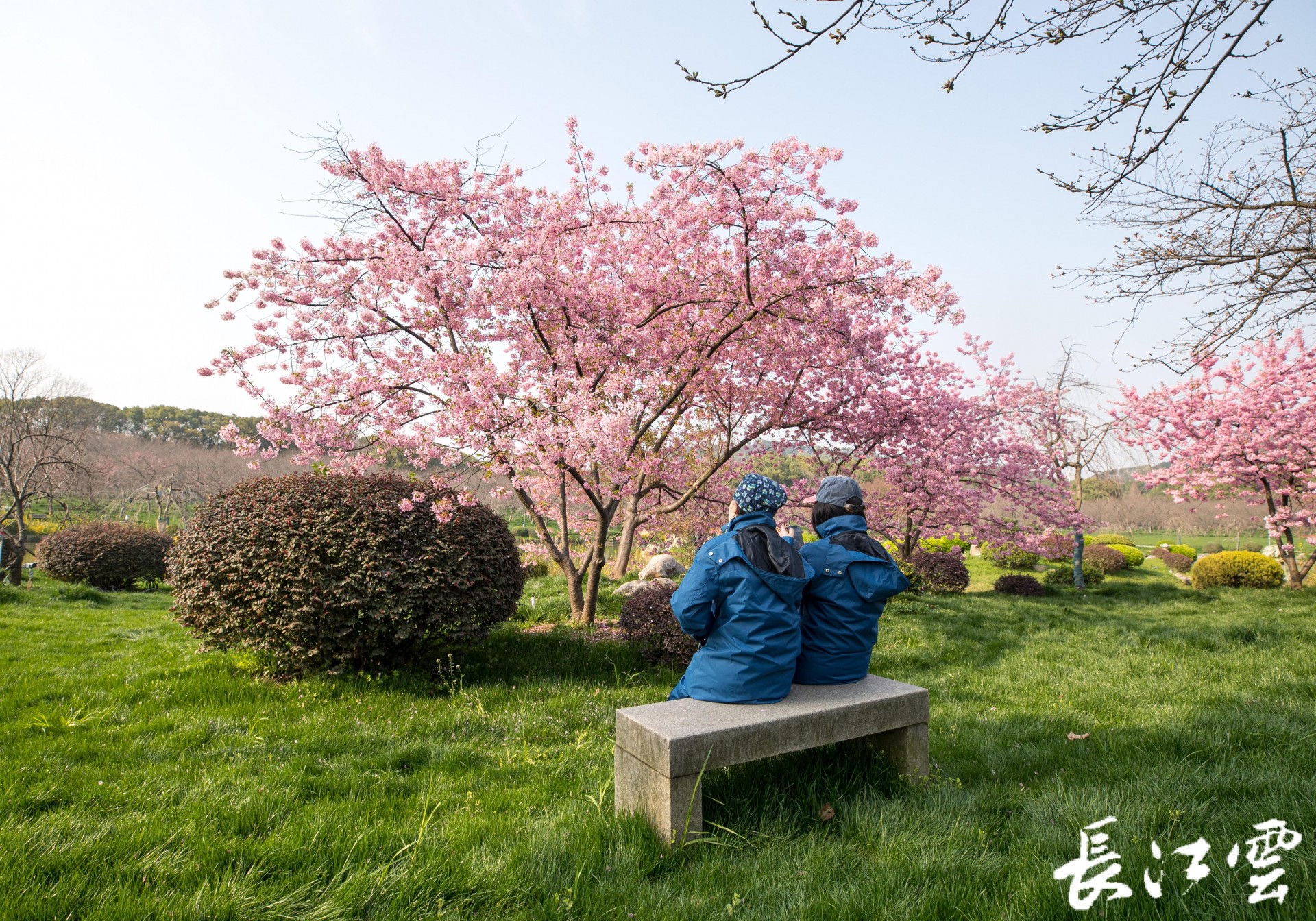 2020年3月,武汉东湖樱园对援鄂医护免费开放。图为两名医护正在樱园赏花。