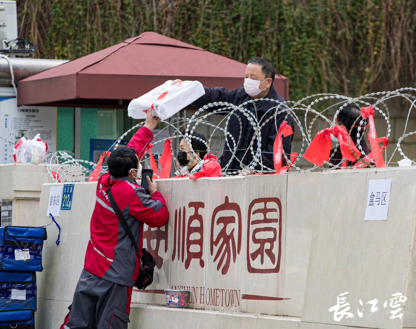 在武汉一小区门口,快递、外卖按照分区有序领取。