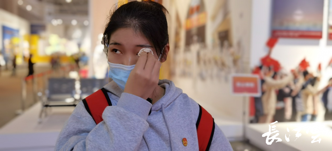 在参观抗疫展中,年轻观众用纸巾擦拭眼泪。
