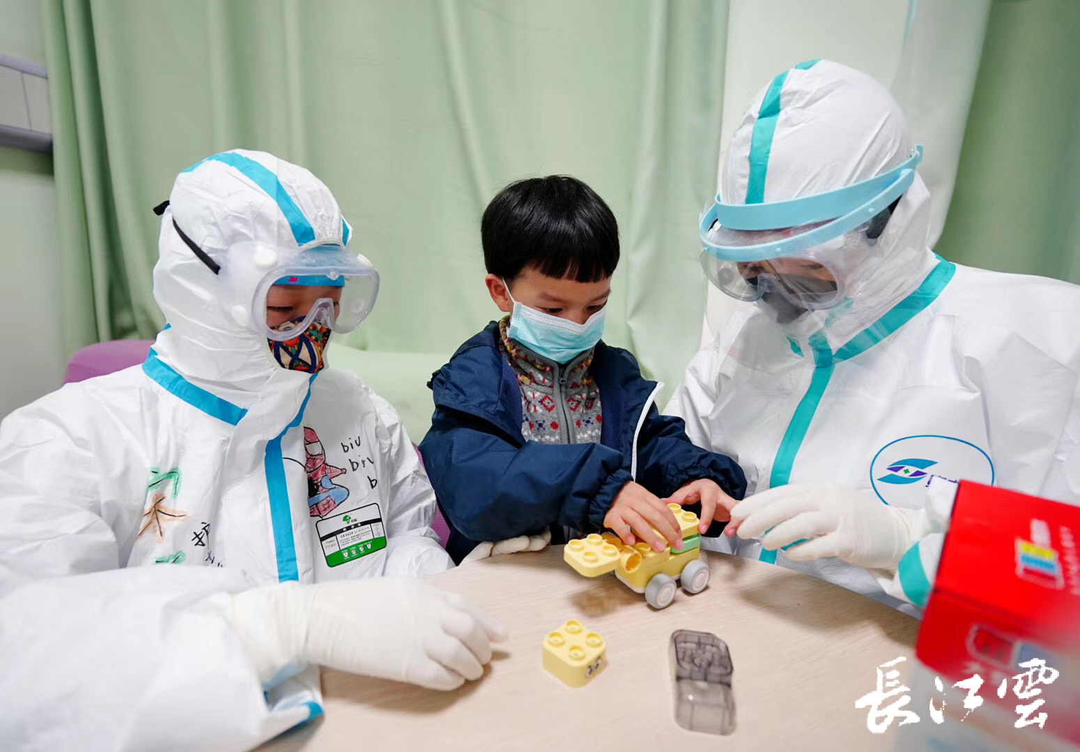 志愿者捐赠的玩具被送到儿童病房,图为小朋友和护士姐姐一起玩玩具。